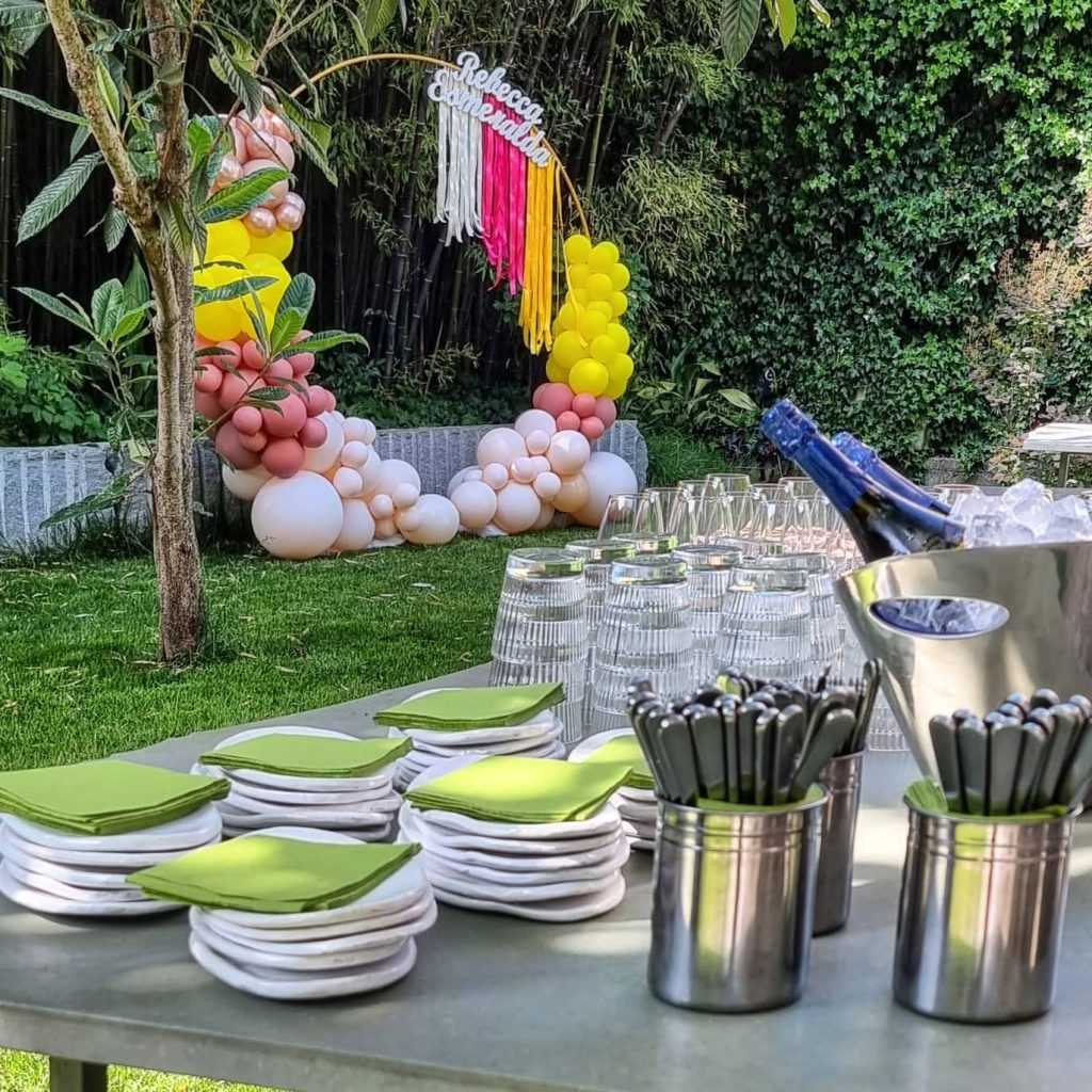 Arco di palloncini DELUXE, scritta nome in legno, dettagli decorativi.
